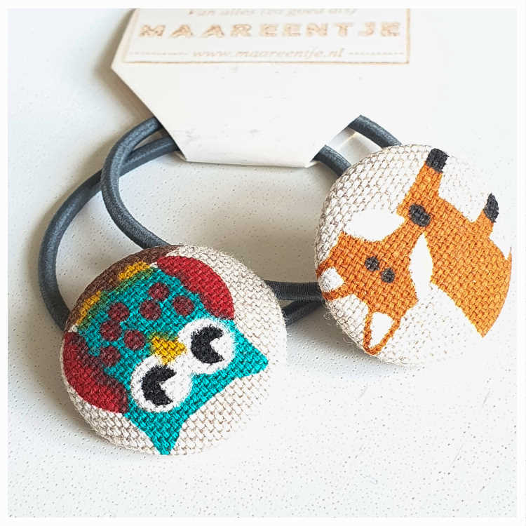 Dit setje haarelastieken is gemaakt van een stevig elastiek met daaraan een stofknoop met een leuk printje in het Forest thema. Er zijn eekhoorns, vosjes, uiltjes, eikeltjes, bloempjes e.d. te vinden in de webshop.