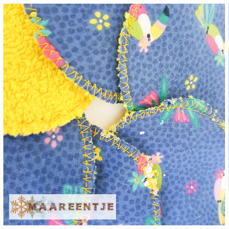 Gemaakt van restjes Badstof en katoenen tricot. Hierdoor ontstaat een leuke mix van kleuren en prints.