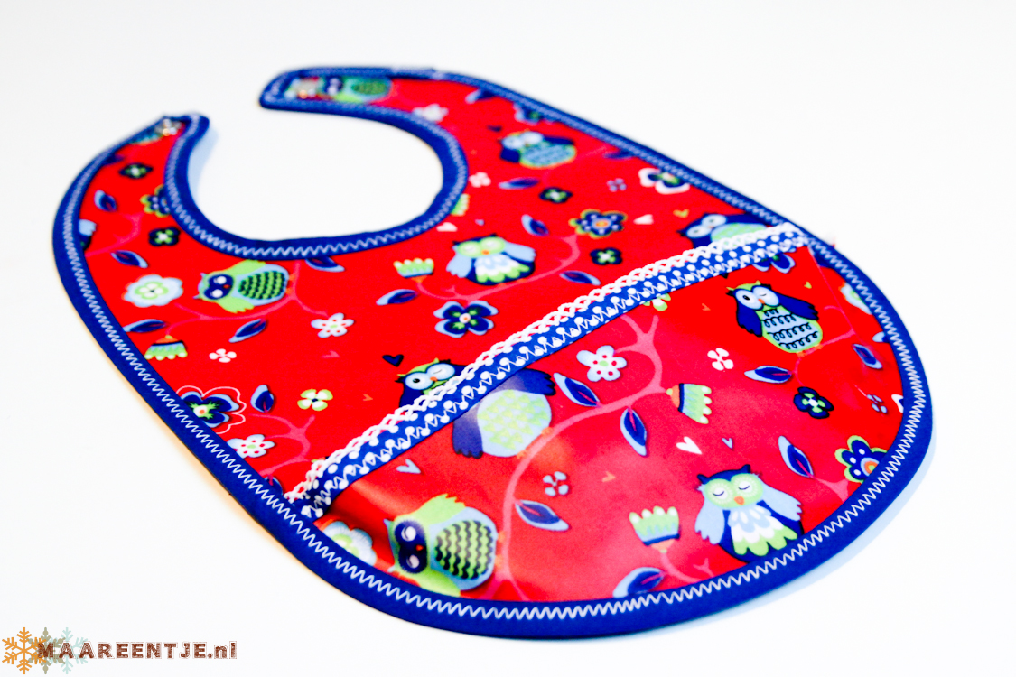 De slabber is netjes afgewerkt met biasband en aan de achterkant een bijpassend katoen stofje. De sluiting is door middel van een drukknoop