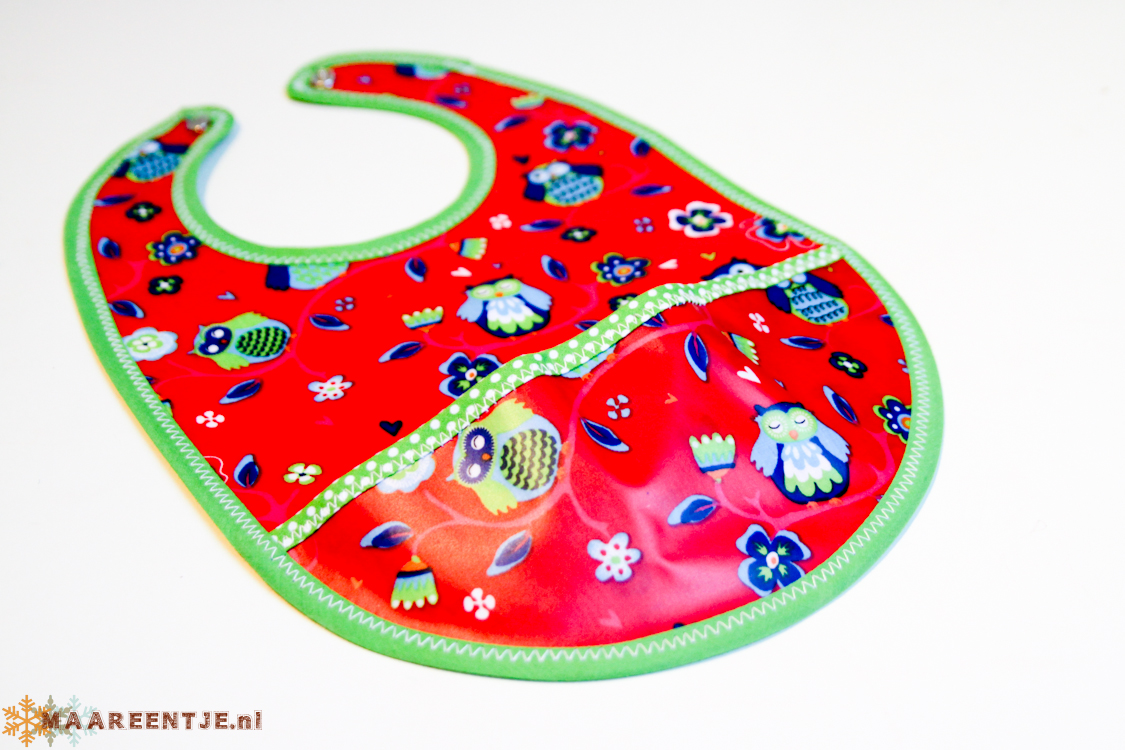 De slabber is netjes afgewerkt met biasband en aan de achterkant een bijpassend katoen stofje. De sluiting is door middel van een drukknoop
